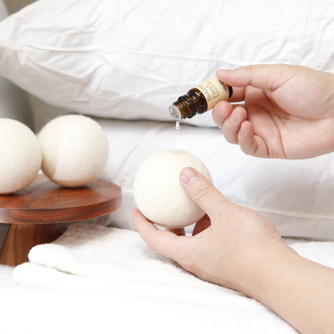 Add 6–12 drops of the essential oil blend directly onto a wool dryer ball. Let it absorb for a minute, then toss 2–3 balls into the dryer with your laundry.