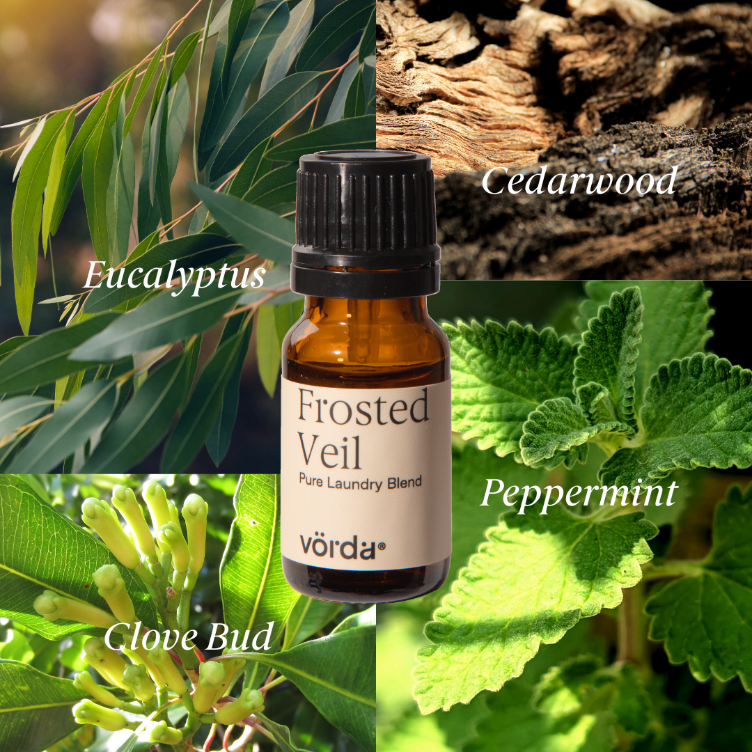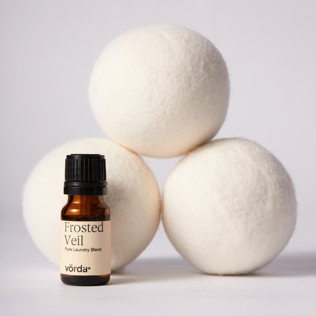Frosted Veil Laundry Blend refreshes your fabrics with crisp mint, cool eucalyptus, and subtle winter spice—crafted intentionally for a clean, serene holiday ambiance. Accompanied by three premium New Zealand wool dryer balls, this eco-conscious set provides a natural alternative to traditional dryer sheets. The invigorating blend and wool balls work together to reduce drying time, soften fibers, and impart a cool, airy fragrance that settles lightly on your linens. Add a breath of winter clarity to your seasonal laundry routine.