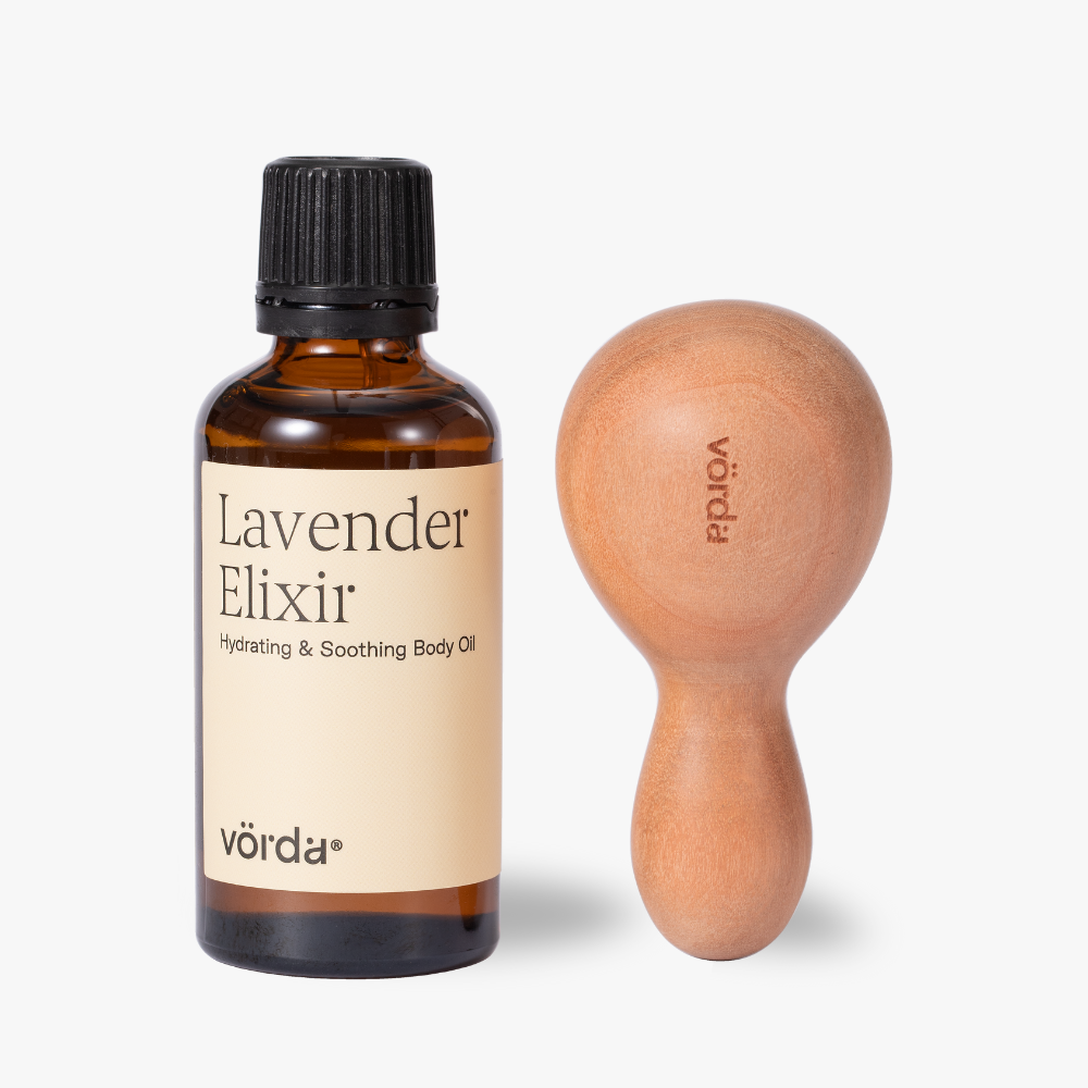 Apply a few drops of the body oil directly to your skin, then use the wood massager with gentle pressure to help absorb the oil and relax tense muscles.